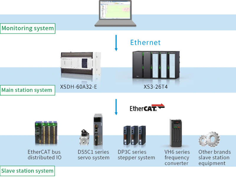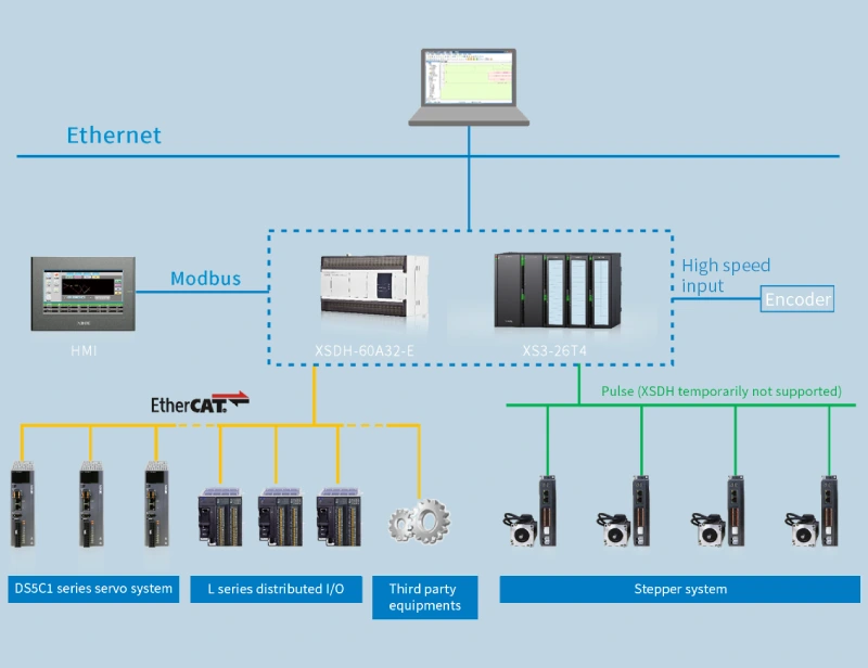 ■ Admite la comunicación con diversos dispositivos con protocolo EtherCAT y puede comunicarse con múltiples dispositivos compatibles con dicho protocolo, con una amplia variedad de tipos. Por ejemplo, la E/S distribuida de la serie XINJE LC3-AP, el servomotor de la serie DS5C1, el motor paso a paso de la serie DP3C y el convertidor de frecuencia de la serie VH6.